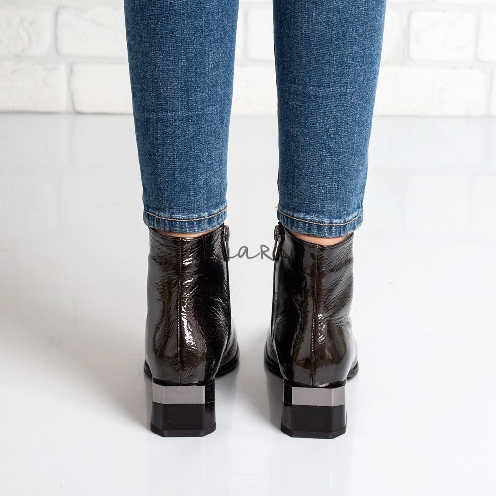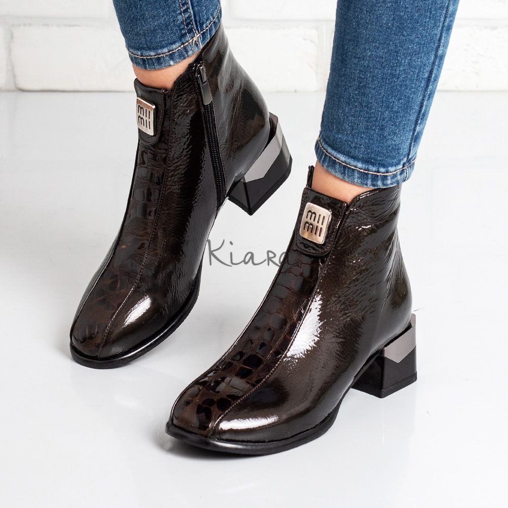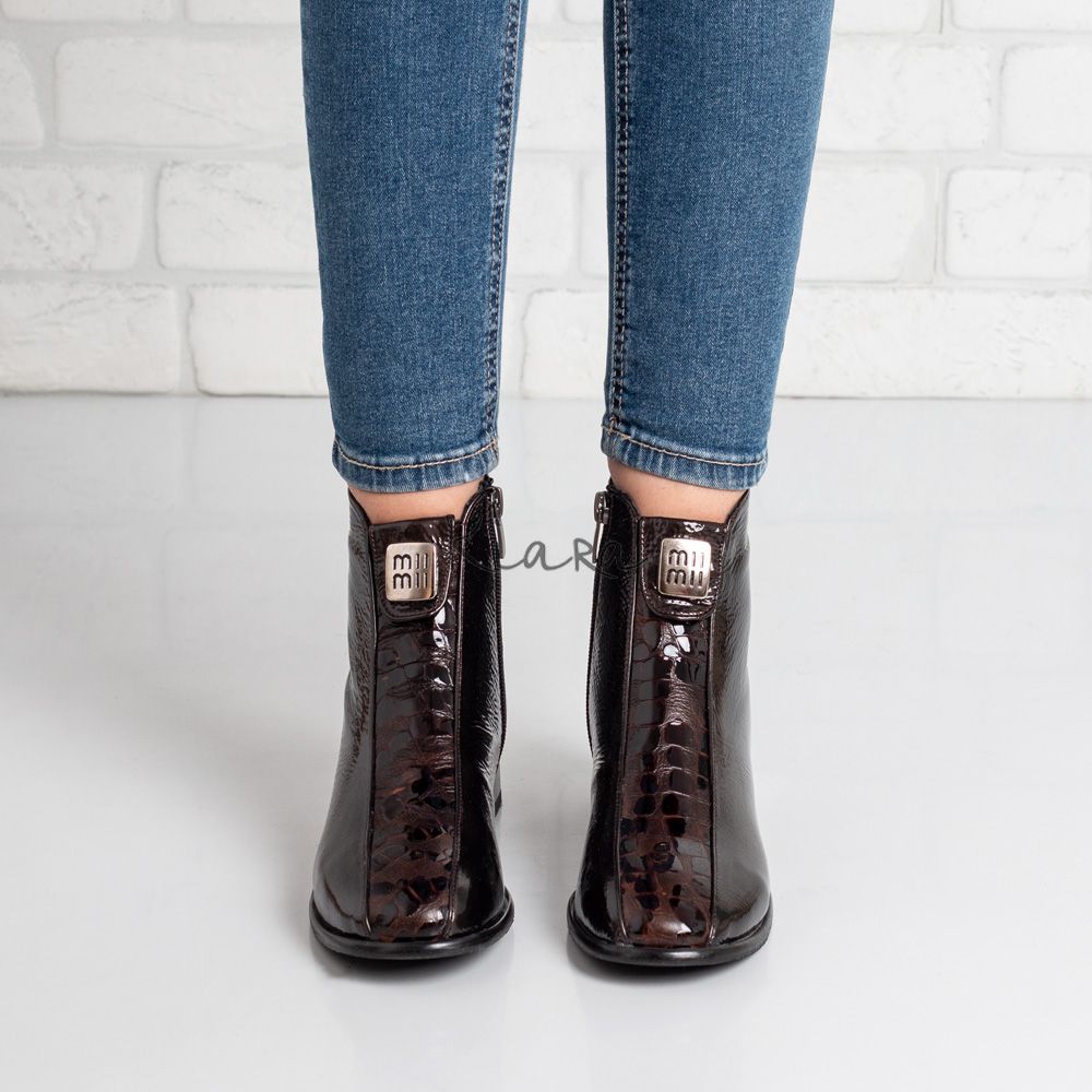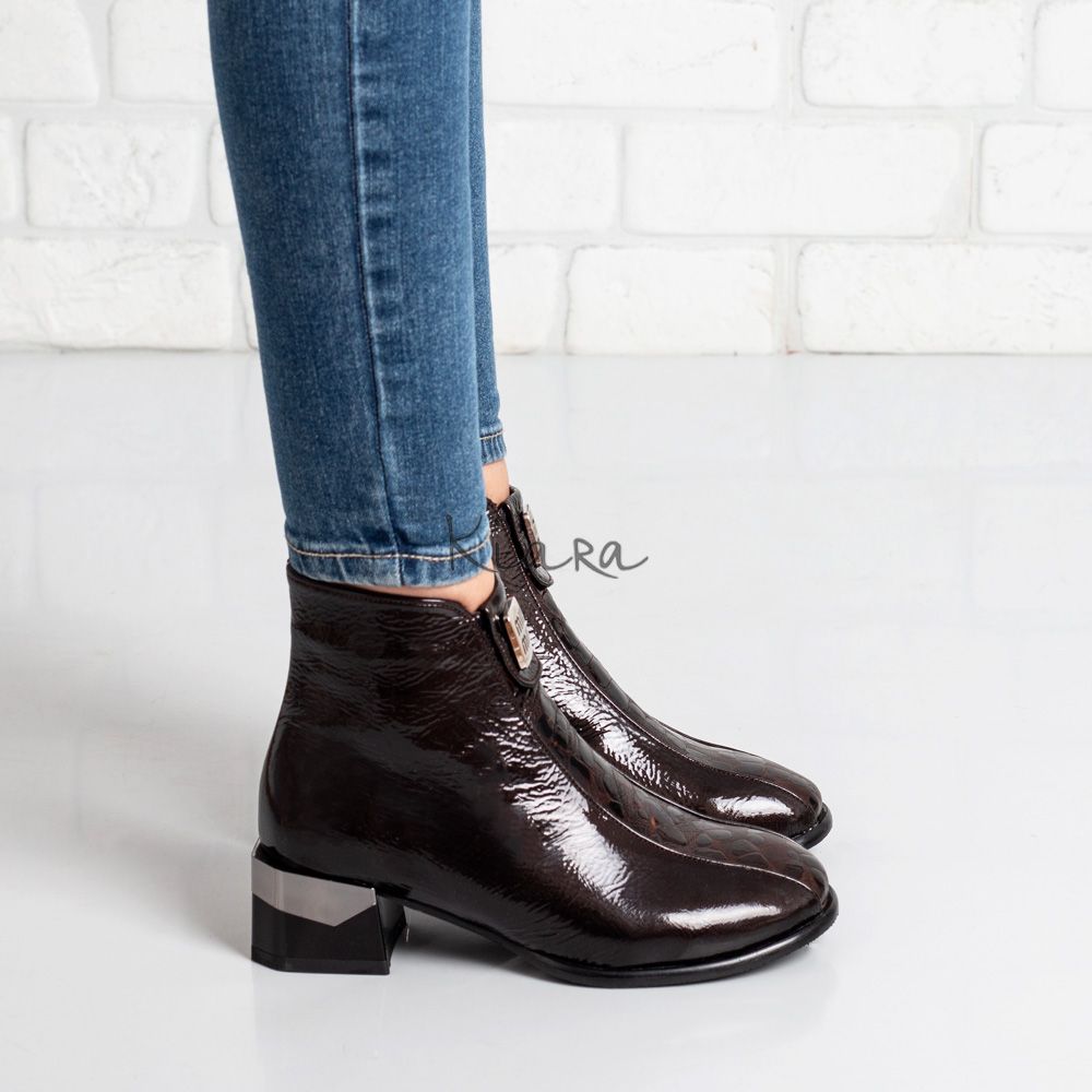 Стилни дамски боти на ток в кафяво, изработени от естествен лак.