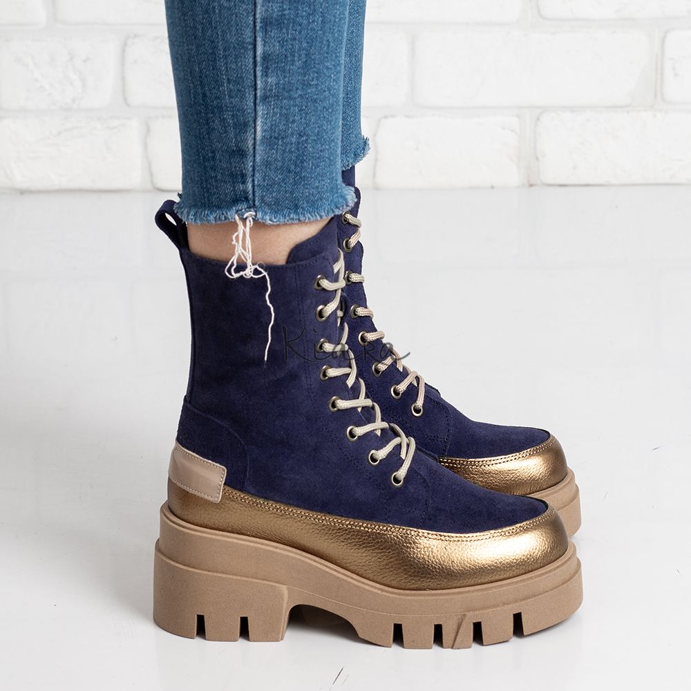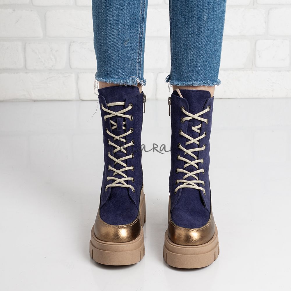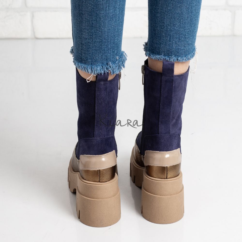 Ефектни и уникални дамски боти в тъмно синьо с бронз, изработени от висококачествена естествена кожа и естествен велур.