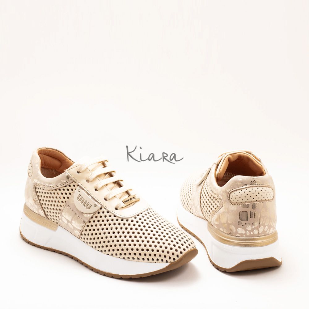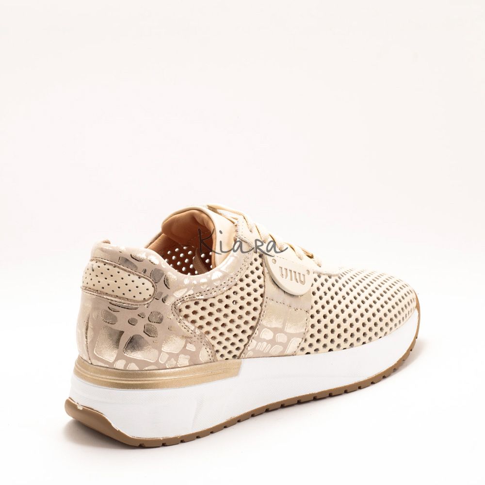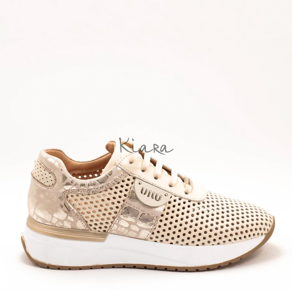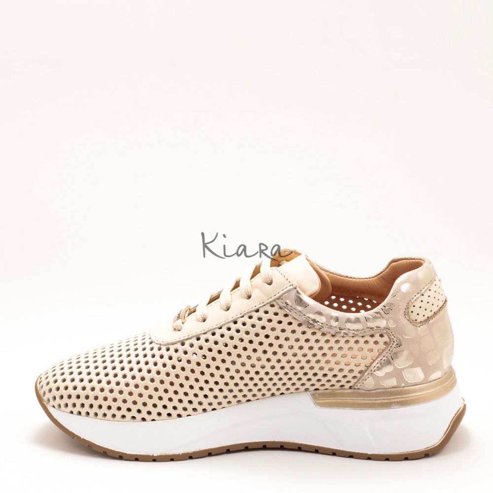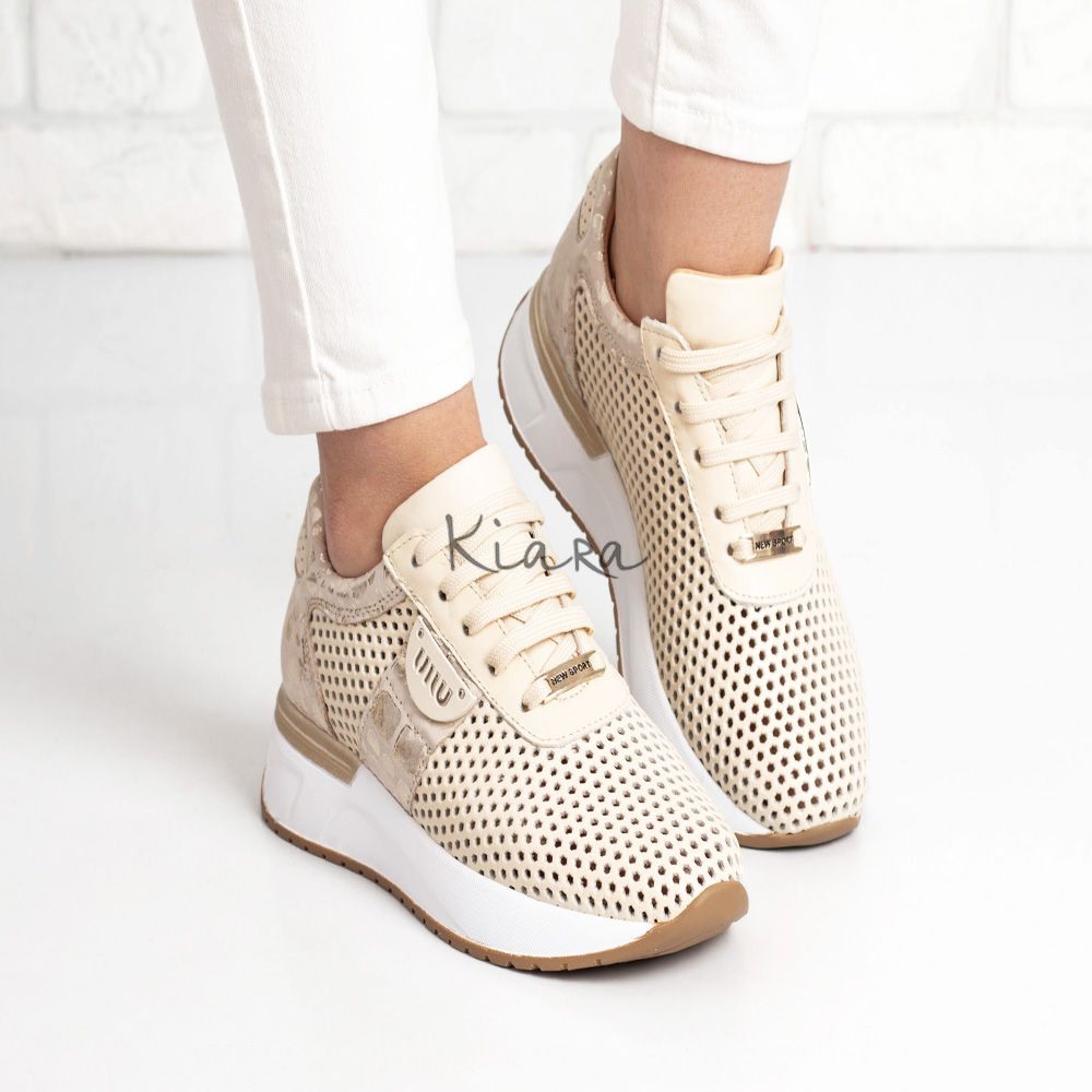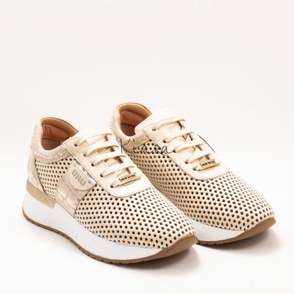 Елегантна визия и безупречен комфорт в едно. Тези бежови маратонки с златист акцент от естествена кожа впечатляват с фин перфориран дизайн, който придава стилен и модерен акцент.