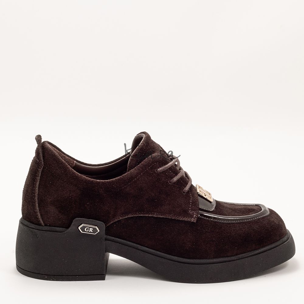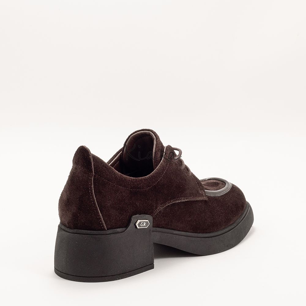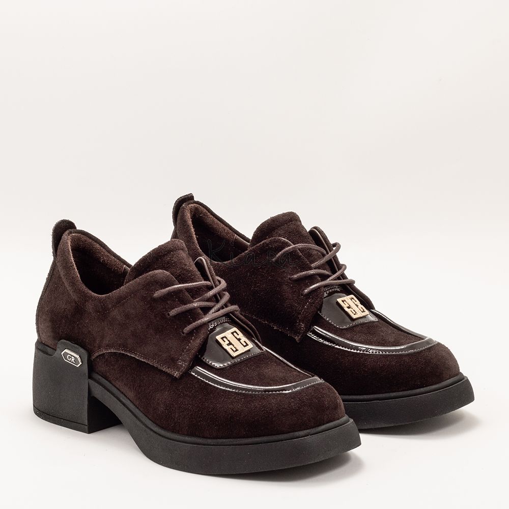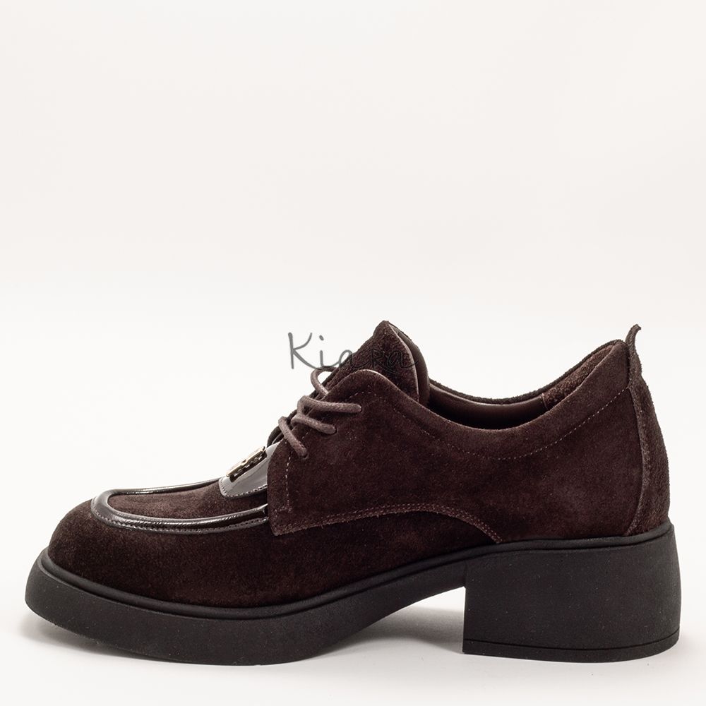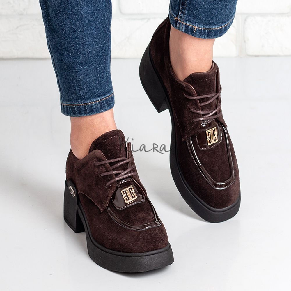 Изискан модел обувки, изработени от висококачествен естествен велур в наситен кафяв нюанс. Фините детайли и металният акцент отпред придават стилна индивидуалност и подчертават модерната линия на дизайна.