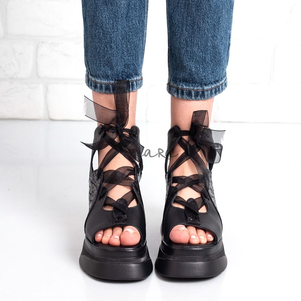 Сандали от естествена кожа с нежна тюлена панделка, съчетаващи комфорт и изискан стил. Меката кожена основа осигурява удобство през целия ден, а ефирният тюл придава романтичен акцент. Идеални както за ежедневието, така и за специални поводи.