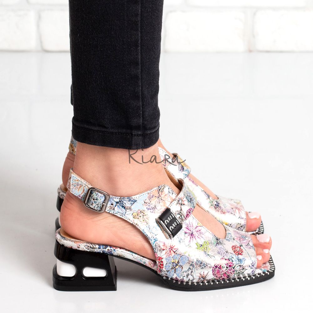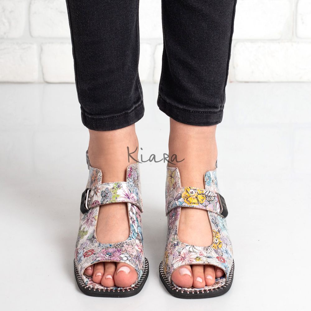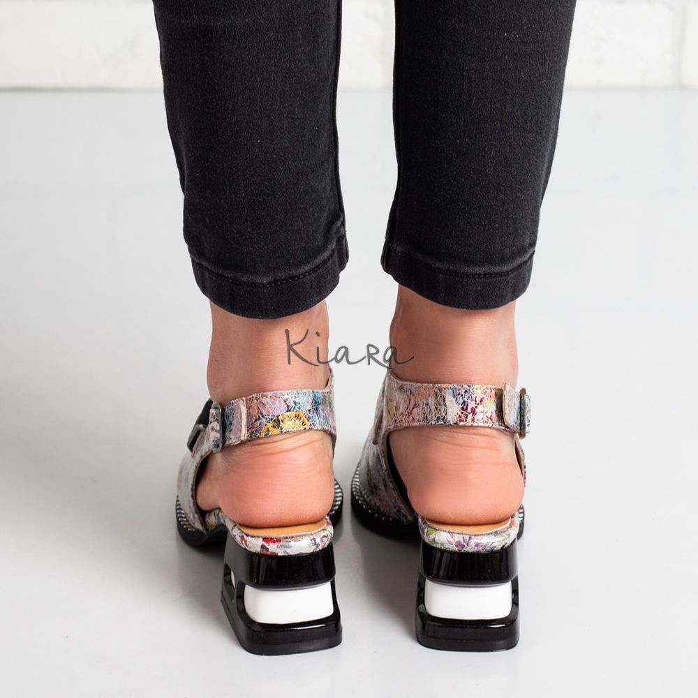 Стилни дамски обувки на ток в сребро с нежен аксесоар, изработени от естествена кожа.